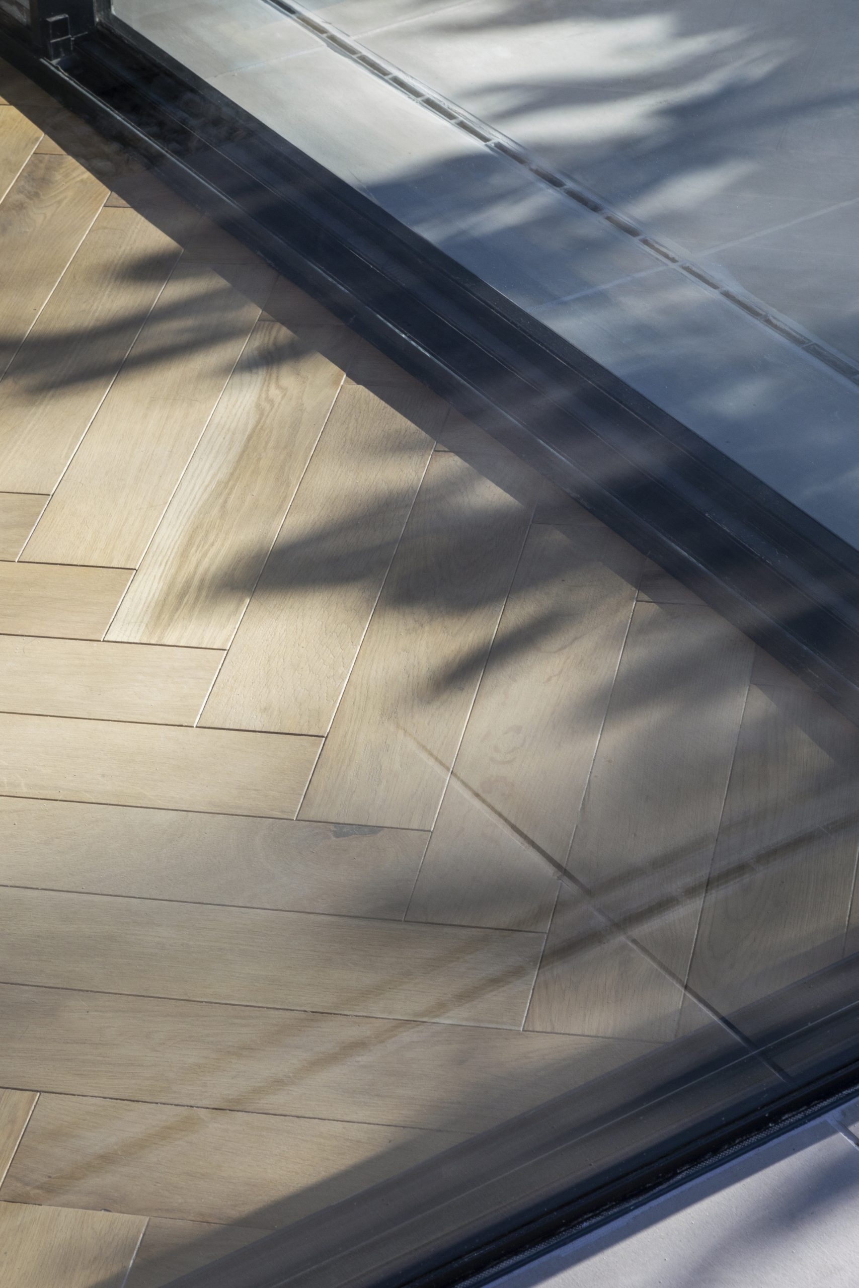 The connection to the garden through the reconfiguration of living spaces and activities. Corner bifold doors were used to maximise the light all around the extension and brightened up the family’s living space.
