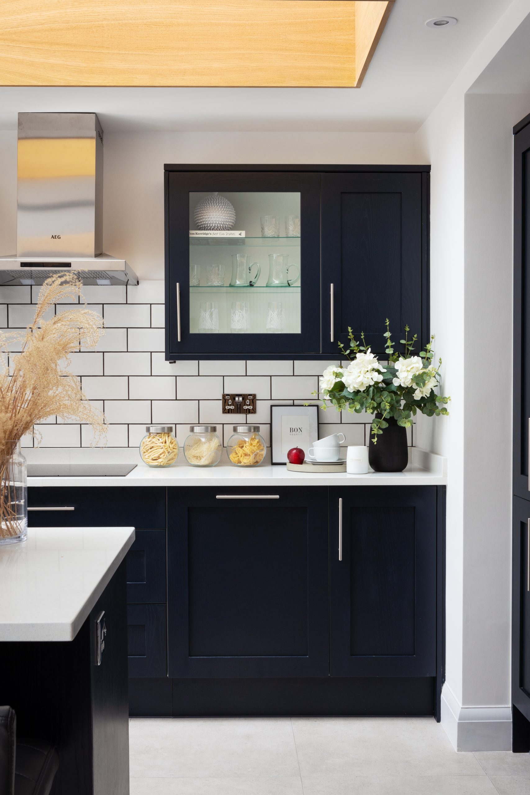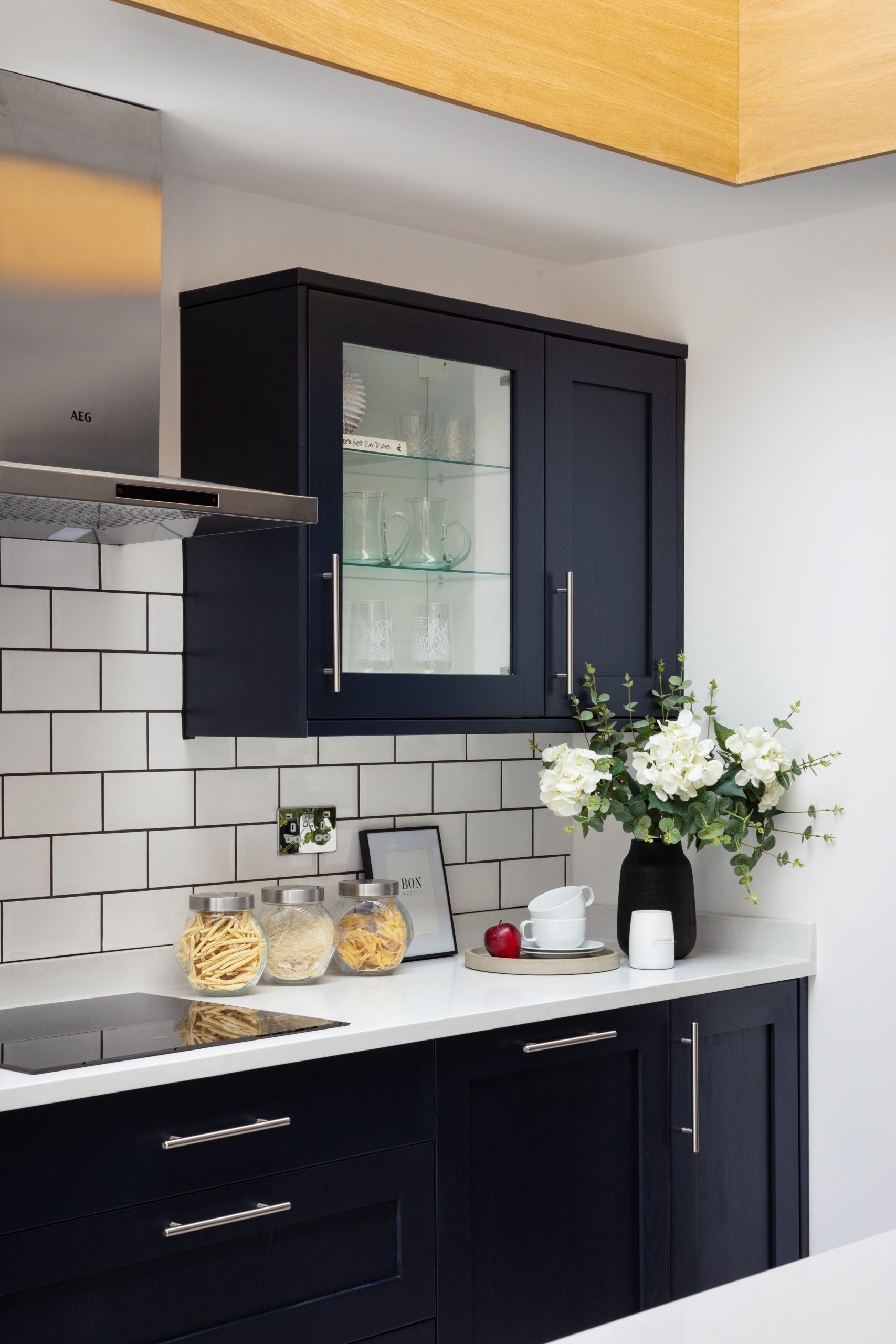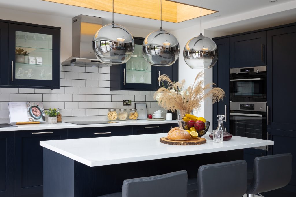 Created an attractive and practical kitchen space, while a kitchen island is always central to a kitchen’s functionality, the chrome pendant lighting really makes it a central feature.