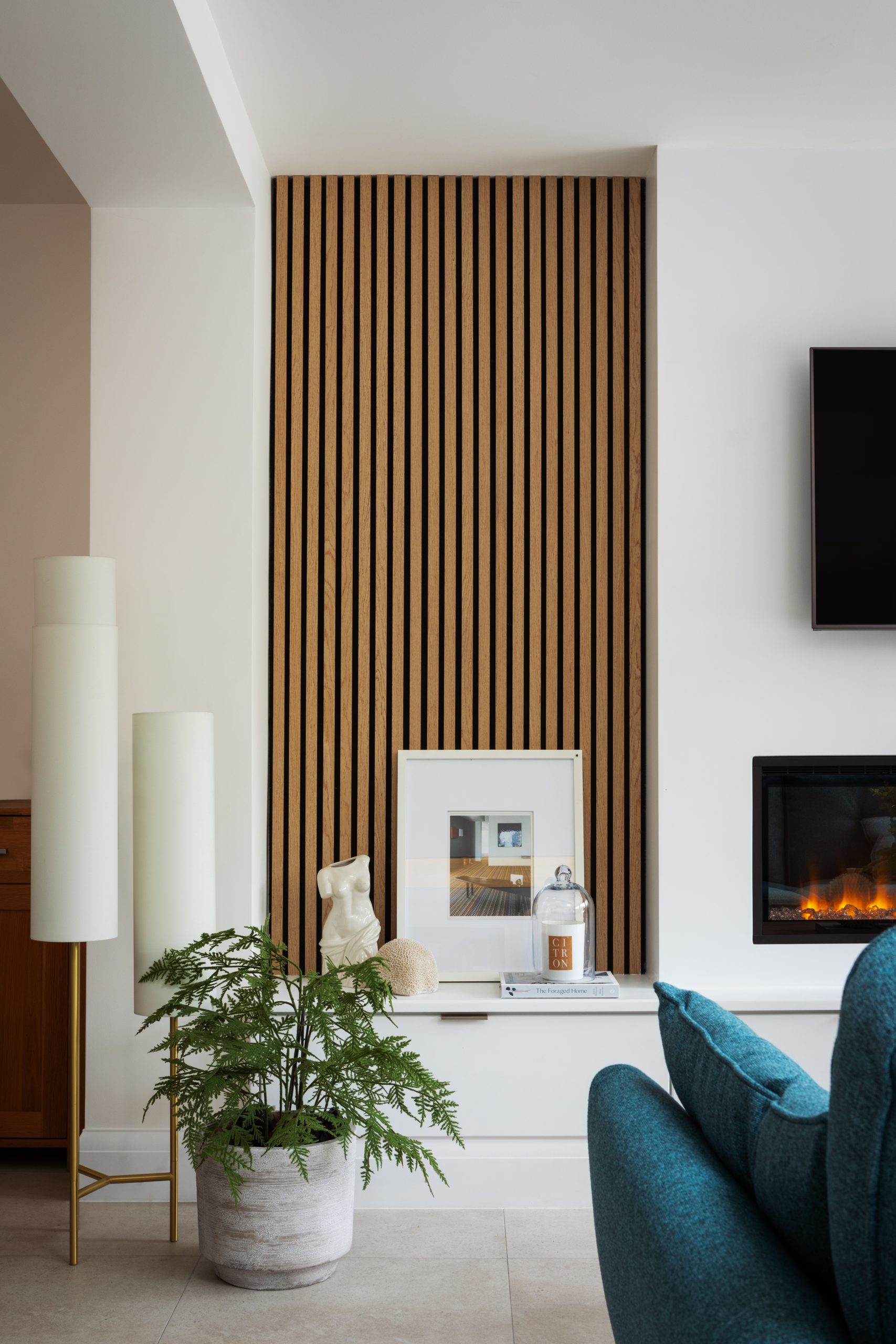 The wood lining mirrored across the skylights and wall seat, balanced with the acoustic panelled feature wall.