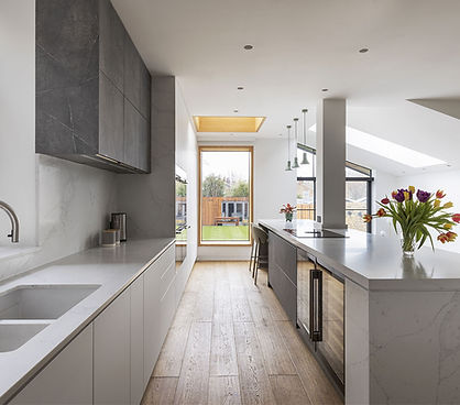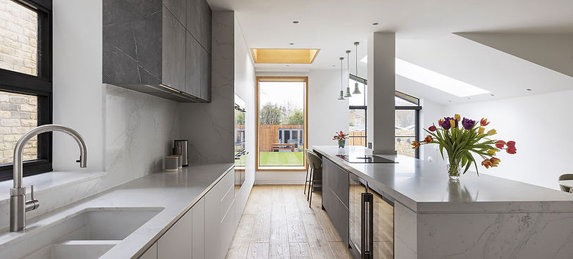 Working with renowned architects Fletcher and Crane, Happy Building undertook a refurbishment and extension project which breathed new life into the existing ground floor and created a new open plan kitchen, living area to the rear with the addition of a contemporary single storey extension. Internally, the front of the house retained it’s character charm with a full refurbishment of the traditional entrance hall, staircase and living room. New joinery, a refurbished WC and simple yet elegant utility room helped to modernise the ground floor and create a transition through to the modern rear extension. The feature window seat, modern kitchen and sunken seating area draw you through to the landscaped garden. Architectural feature glazing showcases a modern facade which blends traditional and modern materials against the original house.