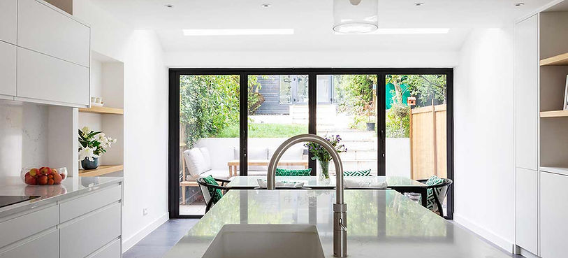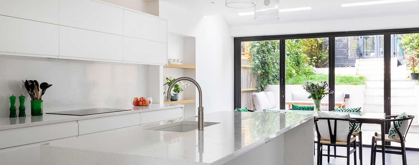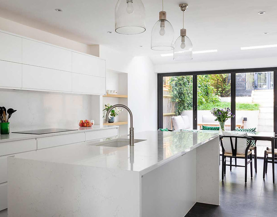 Happy Building worked with the client to unlock the full potential of this 1950’s terraced property. The existing living space and kitchen were located on the 1st floor separating the house from the garden with a lot of under used space on the ground floor. With the addition of a small ground floor extension and clever internal planning, Happy Building created a flowing, contemporary kitchen, dining and seating area with a separate utility space on the entrance level. A newly landscaped garden offered an outdoor area directly connected to the kitchen providing seamless indoor / outdoor living. At first floor level, the existing kitchen was transformed into a study bedroom – improving the usable space and resale value of the property.